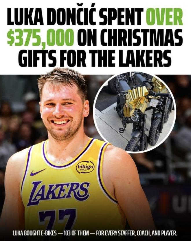 东契奇为湖人全体队员、教练组成员及篮球运营部门工作人员,每人赠送了一辆全新的电动助力自行车,合计送了100多辆。