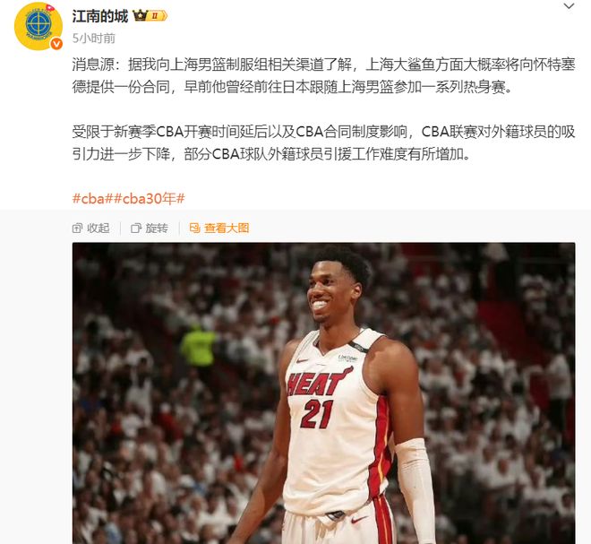 “据我向上海男篮制服组相关渠道了解,上海大鲨鱼方面大概率将向怀特塞德提供一份合同,早前他曾经前往日本跟随上海男篮参加一系列热身赛。”“江南的城”写道。