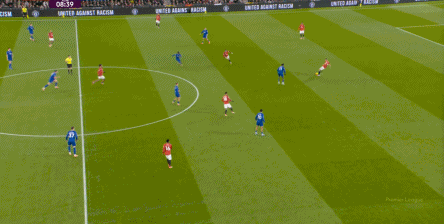 然而在比赛第6分钟,埃弗顿完成了一次非常完整和漂亮的推进,从自家门前开始,格耶假传球真转身,从而直接完成对曼联高位逼抢的破局,随后和中锋配合,衔接到右路完成传中: